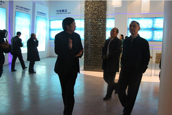图为365上市公司官网董事长明果英先生向侯为贵董事长一行作展馆介绍