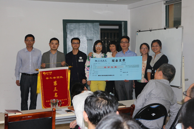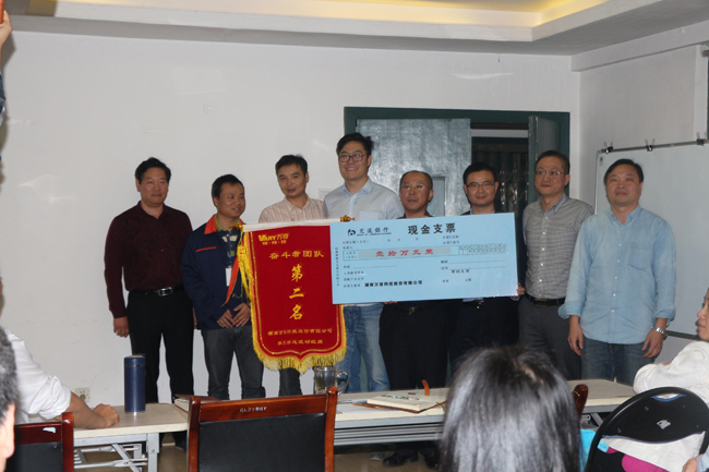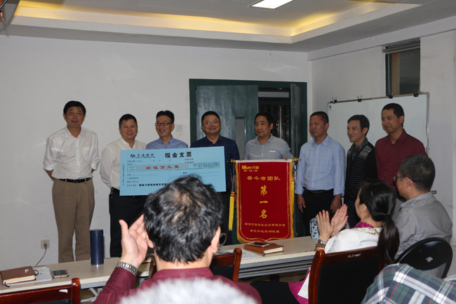 副总经理罗萍为伍亦雄、何钊颁发三季度“奋斗者标兵”奖杯及5万元现金支票
