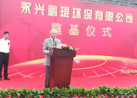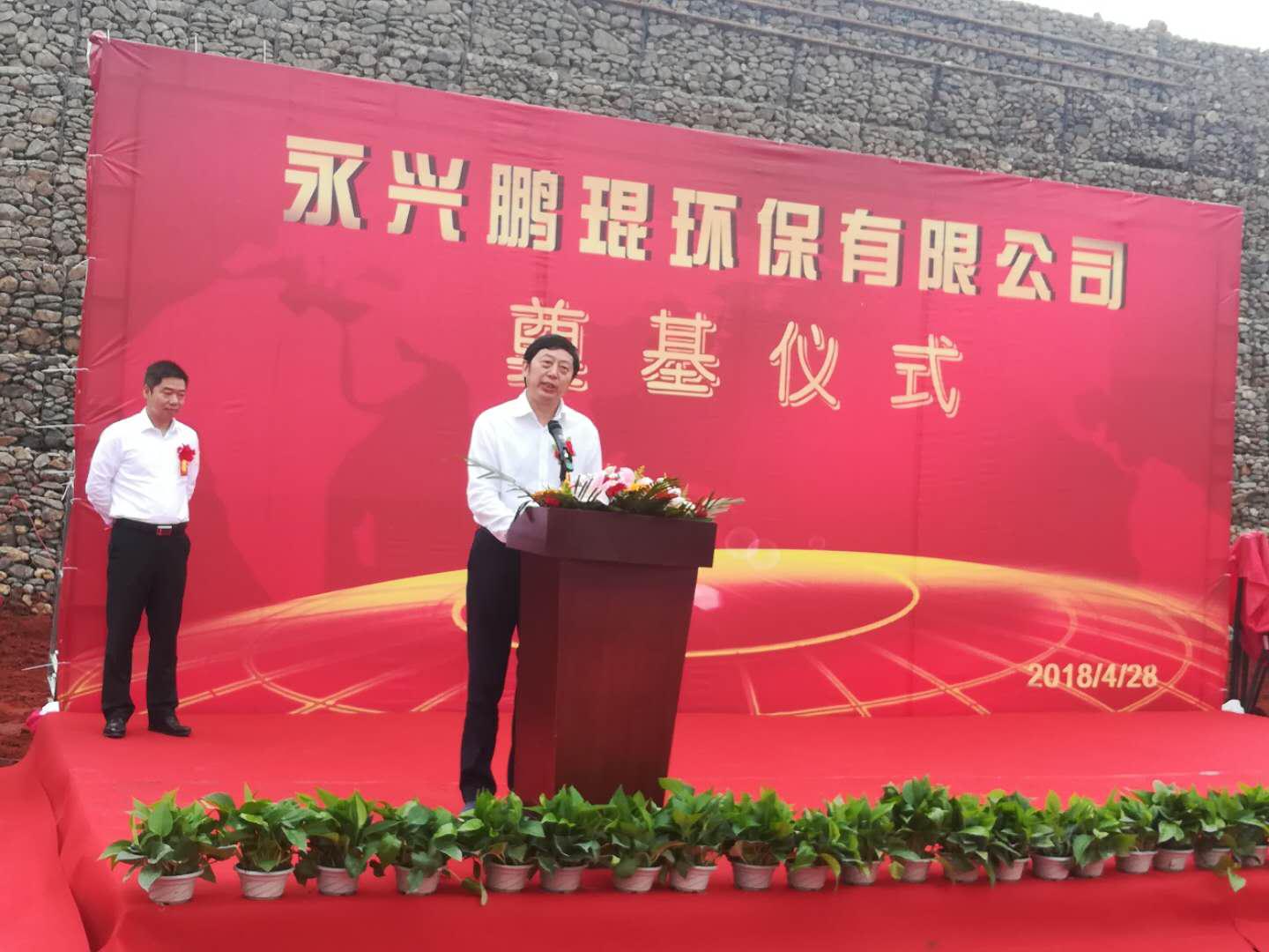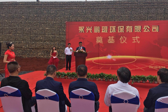 广东绿晟环保股份有限公司总经理胡鹏飞代表公司致开幕辞。他首先对各位领导、各位来宾的到来表示热烈的欢迎和衷心的感谢,并介绍了本次奠基开工项目的基本情况,项目采用低温绝氧热解技术以及工信部鼓励的富氧侧吹熔炼产业协同处置技术,可真正实现固废资源化利用,达到节能减排、降低环境污染风险的目的,具有显著的经济、环保、生态效益,预计土建工程在今年12月底全面完成,2019年上半年可实现试生产。胡鹏飞总经理热情高扬地表示公司完全有信心、有决心、有能力通过的设计、的施工、的技术设备、的管理打造湖南省乃至全国标杆示范工程。