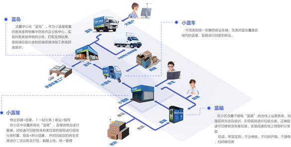 「三网融合」蓝色体系是以政府采购服务推进,因地制宜覆盖整个城乡区域,以回收利用处置效果支付项目服务费,通过以大数据平台为线上支撑,以蓝箱、小蓝屋、小蓝车、蓝岛为线下体系,以物联网设备为辅助,利用自建的共享型互联网大数据智慧云平台系统,通过用户绿色账户系统、蓝屋管理系统、收运管理系统、分拣处置管理系统等,实现生活垃圾四分类中可回收物、有害垃圾高效收集、运输和处置。并通过建立基于地理位置的数据大盘,实时抓取各个环节中的数据,实现各小区、各社区(村)、各街道(镇)、各区数据统计、分析、排行,为垃圾分类回收利用提供实时准确的数据支撑,同时,也便于对项目的监督与考核。