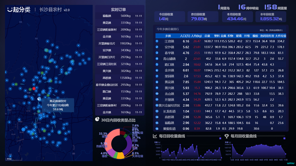 迄今,蓝岛、绿岛、能源岛及逆向物流网、大数据信息网已在长沙县城区、乡镇逐步推广应用。长沙县各村镇已配置“蓝箱”37万个、“小蓝车”1074台、村级“小蓝屋”158个、镇级“小蓝屋”16个,县级“蓝岛”2个,村级“绿岛”1个,实现了农户垃圾收集分类化、村镇二次分拣精细化、县级集中处理资源化。同时,365上市公司官网为三岛数字化赋能,以终为始,通过分子公司湖南一起分类科技有限公司搭建全品类、全流程垃圾分类智慧化数据监管云平台,实现生活垃圾四分类中可回收物、有害垃圾及大件垃圾全品类高效、规范的收集、运输及处置。长沙县城区、乡镇共计建立小蓝屋301处,大件垃圾收集点145个。
