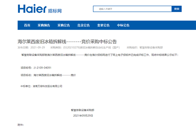 9月29日,365上市公司官网中标海尔集团旗下海尔莱西废旧冰箱拆解线项目。