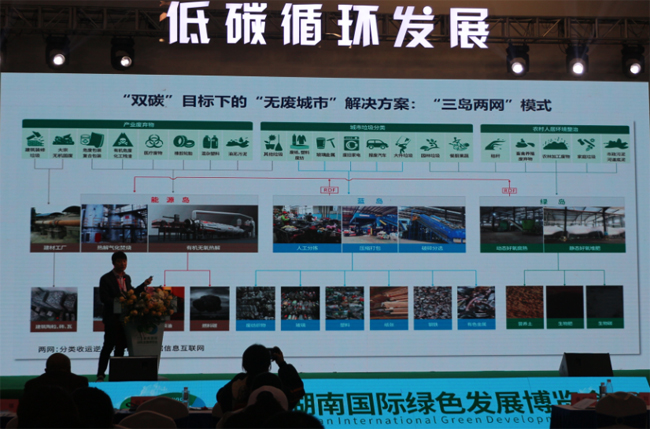 一起分类总经理宋镇就再生资源回收处置现状,结合公司实际再生资源回收及体系建设经验,提出了“双碳”目标下的回收利用“三岛两网”模式解决方案,以分类收运逆向物流网及大数据物联网为线上支撑,线下通盘统筹考虑实体体系,从废旧物资回收利用体系延伸至产业废物、城市生活垃圾和农业废物的体系搭建,借助机械生物MBT技术、破碎分选技术、无氧热解技术、快速腐熟技术,按资源分类回收进入蓝岛、绿岛、能源岛进行综合化利用,实现让垃圾变资源。目前引入该模式的许昌市魏都区“无废城市”建设项目成为首批生态环境导向的开发(EOD)模式试点中一个以「无废城市」入选项目。